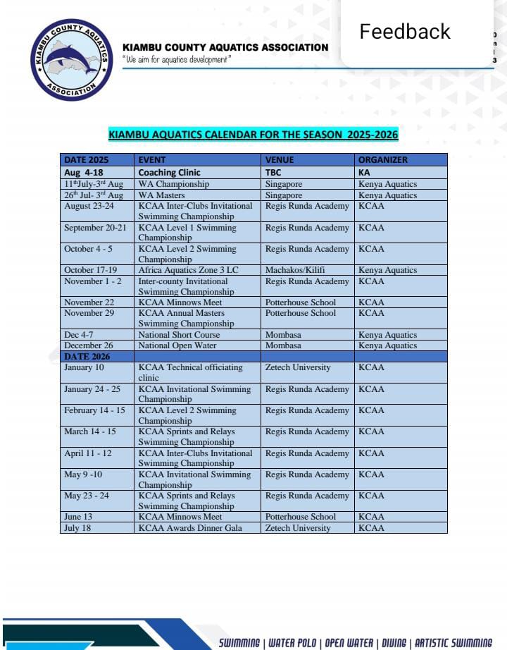 Dive into the heart of Kiambu County’s aquatic sports scene! Our events page is your gateway to the exciting world of swimming galas, training camps, workshops, and community outreach programs. At KCAA, we bring together athletes, coaches, and enthusiasts to celebrate the spirit of competition, foster growth, and promote water safety.